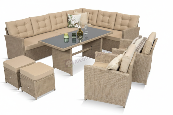 Zestaw mebli technorattanowych to propozycja, która spełni oczekiwania nawet najbardziej wymagających Klientów. W skład opisywanego kompletu wchodzi prostokątny, duży stół jadalniany o długości 145cm, dwie pufy, dwa fotele oraz narożnik składający się z dwóch sof dwuosobowych, modułu środkowego i modułu narożnego. Dzięki modułowej budowie narożnik może być lewo bądż prawostronny. Całkowite wymiary narożnika po zestawieniu modułów to 250x190cm. Na każde siedzisko i oparcie przewidziano wygodną poduszkę. Komplet wykonano z bardzo dobrych jakościowo materiałów, zachowując jednocześnie najwyższą dbałość o każdy szczegół. Meble te nadają się nie tylko do użytku wewnętrznego ale i zewnętrznego.