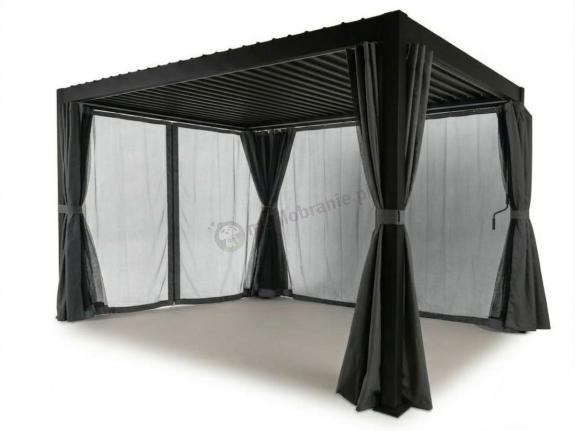 Zestaw zasłon i moskitier do pergoli Nefir 2x4 chroni przed słońcem, wiatrem i owadami. Wykonany z poliestru komplet na cztery ściany wyposażono w zamki błyskawiczne, troczki stabilizujące oraz system szybkiego montażu na haczykach w fabrycznych prowadnicach stelaża.