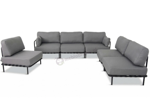 Stylowe meble ogrodowe modułowe Salve 6 wykonano na stelażu ze stali nierdzewnej, która pomalowana została proszkowo na kolor czarny. Stelaż zachowany jest w eleganckim wykończeniu matowym. Taki stelaż jest odporny na działanie niekorzystnych warunków atmosferycznych a także gwarantuje stabilność całego mebla. Konstrukcja siedziska każdego z modułów oparta jest na wytrzymałych pasach nośnych - są one przeplatane, dlatego też tworzą solidną i wytrzymałą powierzchnię nośną siedziska. Dodatkowo, takie rozwiązanie służy także jako element dekoracyjny.