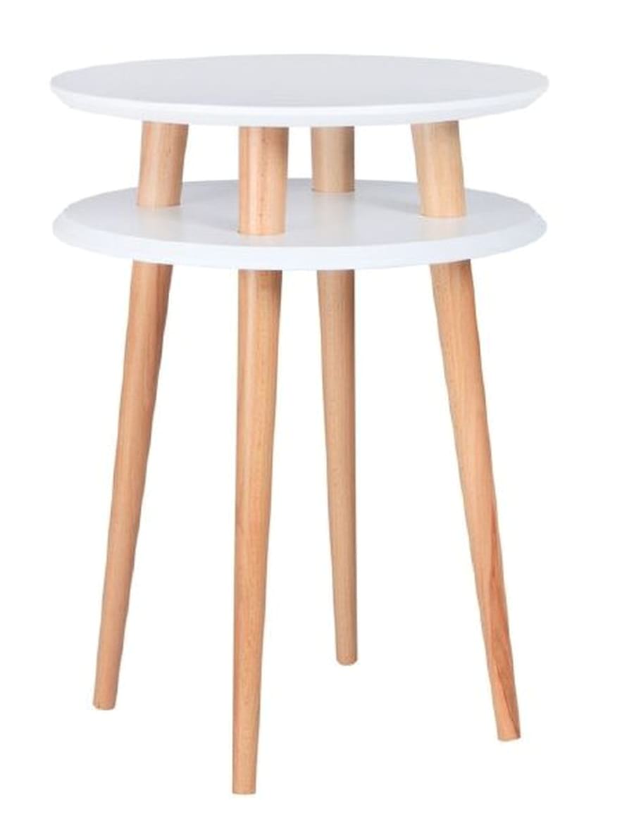 Okrągły stolik kawowy UFO High to najwyższy model z serii UFO mający aż 61 cm wysokości. Jego cechą charakterystyczną jest podwójny blat o średnicy 45 cm. Górny blat doskonale nadaje się jako miejsce na przekąski, dolny natomiast to dobre miejsce na schowanie drobnych przedmiotów. Oba blaty wykonano z lakierowanej płyty MDF.