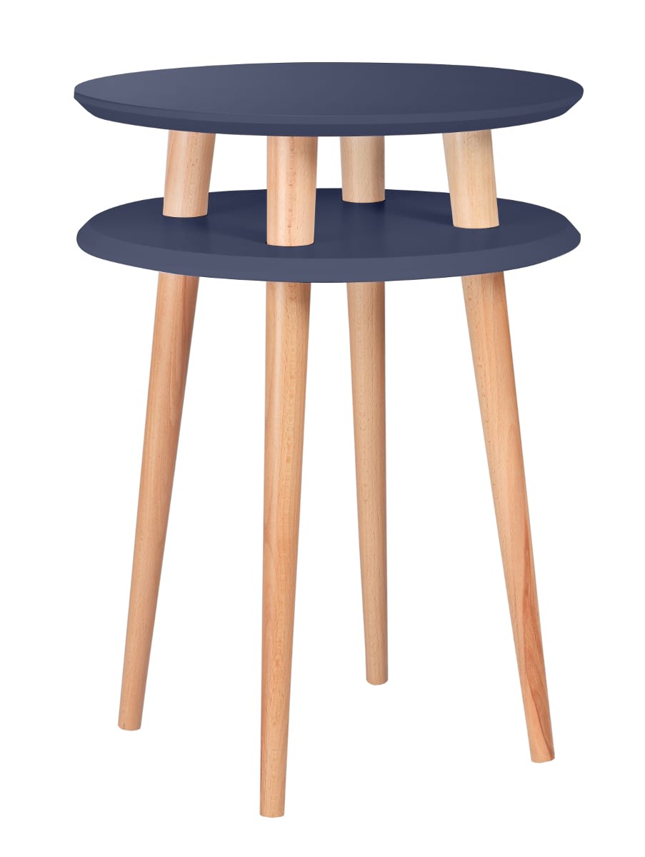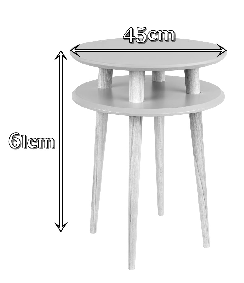 Okrągły stolik kawowy UFO High to najwyższy model z serii UFO mający aż 61 cm wysokości. Jego cechą charakterystyczną jest podwójny blat o średnicy 45 cm. Górny blat doskonale nadaje się jako miejsce na przekąski, dolny natomiast to dobre miejsce na schowanie drobnych przedmiotów. Oba blaty wykonano z lakierowanej płyty MDF.