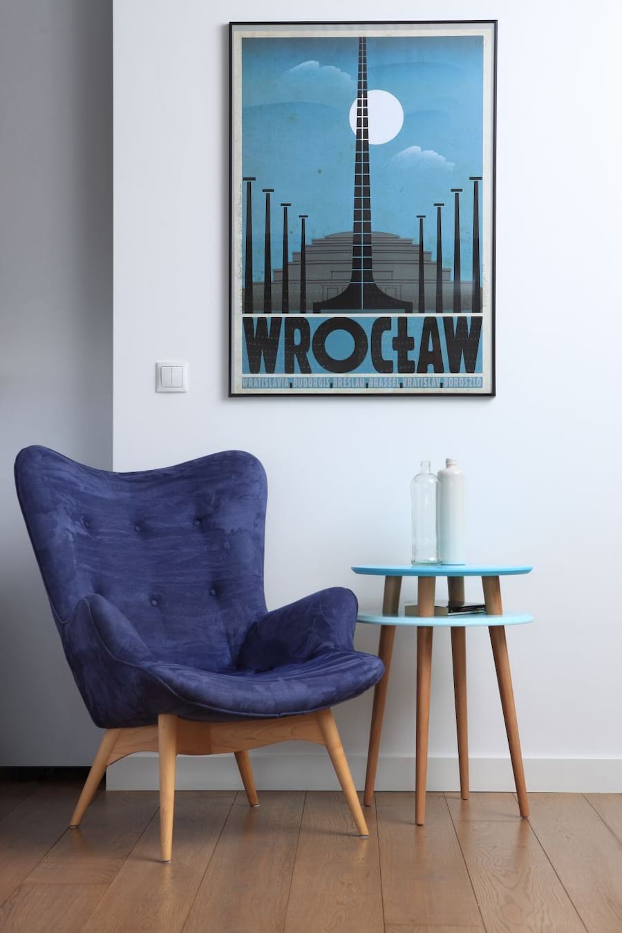 Poniższe zdjęcie przedstawia aranżację ze stolikiem w kolorze turkusowym.