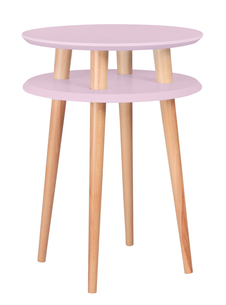 Podstawa jasnoróżowego stolika UFO High to cztery nogi z drewna bukowego.
