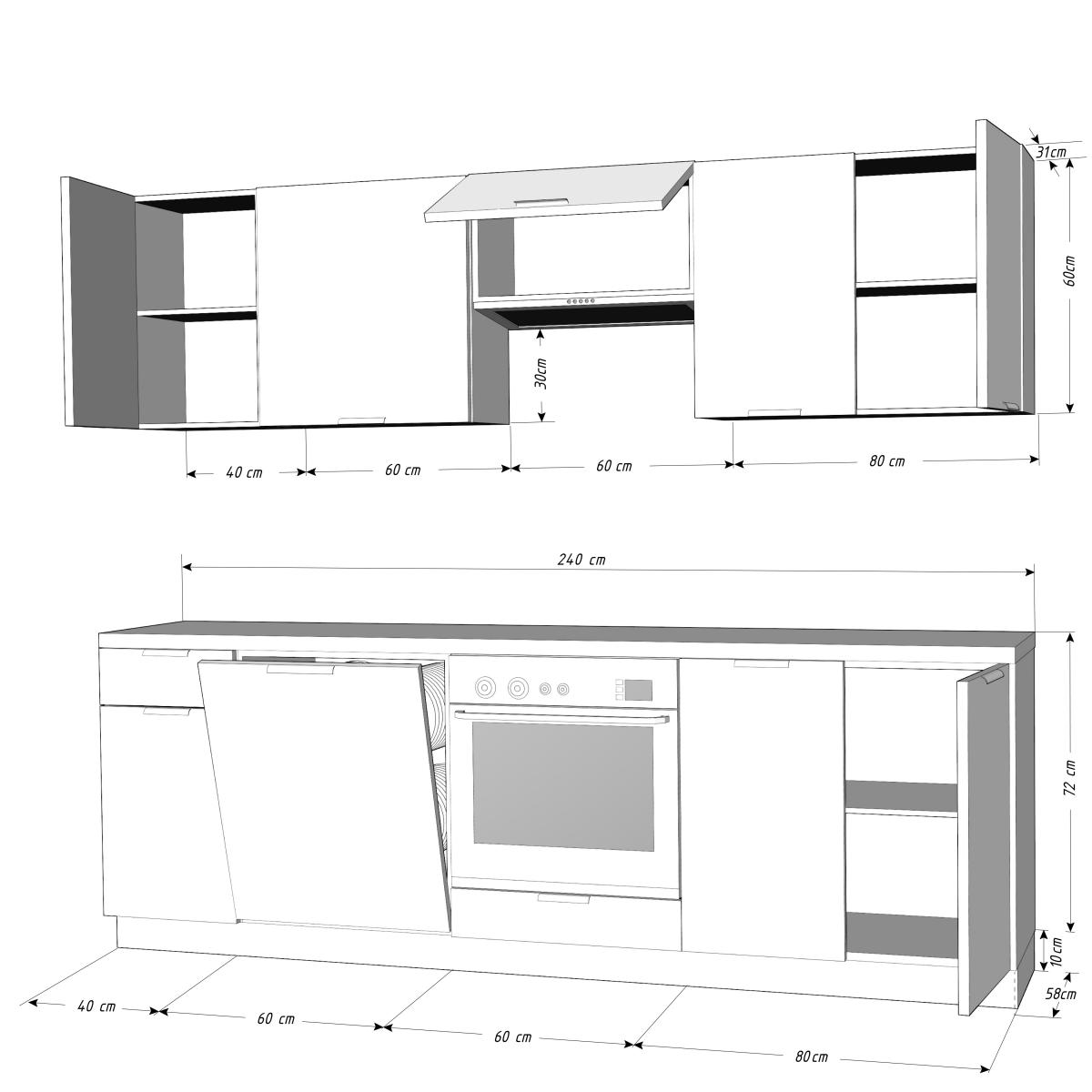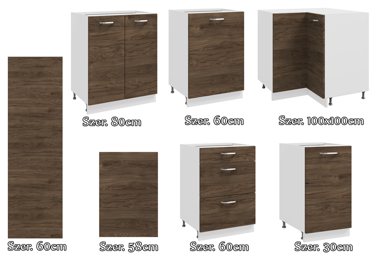 Szafki stojące wyposażone są w 10 cm nóżki pozwalające na szeroką regulację poziomu. Posiadają standardową wysokości 82 cm łącznie z nóżkami. Wysokość szafek wiszących to 60 cm. W skład zestawu wchodzą: szafki wiszące szer. 40,60 i 80 cm z półką, szafka nad okap, szafka do zabudowy zlewu 80, szafka 40 z jedną szufladą i półką oraz front do zabudowy zmywarki 60 z ukrytym panelem sterującym.