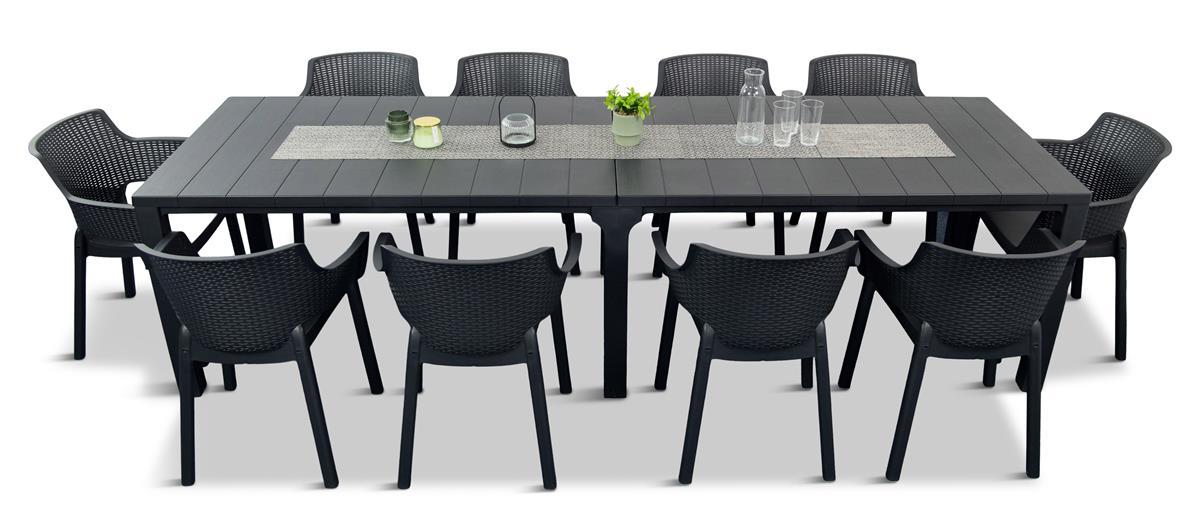 Zestaw ogrodowy Meblobranie EJD10 to doskonałe rozwiązanie jeżeli od czasu do czasu potrzebujemy zorganizować spotkanie w większym gronie na naszym tarasie lub w ogrodzie i zapewnić miejsce dla wielu gości. Zestaw składa się z funkcjonalnego stołu obiadowego oraz 10 ażurowych foteli. Jest to doskonała alternatywa dla obecnych na rynku produktów z technorattanu. To co wyróżnia prezentowany zestaw, to możliwość stworzenia 3 konfiguracji - stoły połączone dłuższymi bokami, stoły połączone krótszymi bokami oraz wariant z pojedynczym stołem do wykorzystania na co dzień.