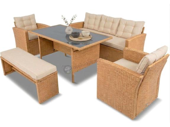 Prezentowany zestaw mebli ogrodowych z sofą i fotelami opiera się na stabilnym, metalowym stelażu. Pokrywa go technorattanowa podwójna plecionka o szczotkowanej strukturze. Materiał ten jest łatwy w utrzymaniu w czystości. Do tego celu wystarczy zwilżona ściereczka. Niezaprzeczalną zaletą prezentowanego zestawu jest fakt, że poduszki dołączone do zestawu są impregnowane - dzięki czemu woda czy rozlane płyny nie wchłoną się szybko w materiał a powstałe zabrudzenia będzie bardzo łatwo wyczyścić.