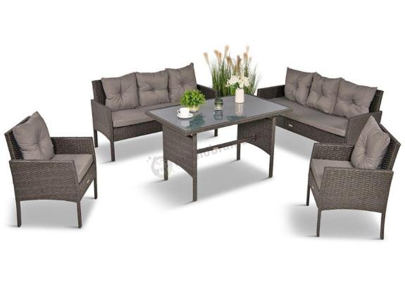 W skład technorattanowego kompletu mebli na taras wchodzą dwie trzyosobowe sofy, dwa fotele oraz uniwersalny stół ogrodowy, tworząc miejsce dla 8 osób. Oferowany komplet jest wielofunkcyjny. Dzięki aż dwóm sofom, zestaw stworzy wiele miejsca do odpoczynku. Wysoki stolik o uniwersalnym rozmiarze 120x70 cm ze szklanym blatem sprawdzi się do spożywania posiłków na świeżym powietrzu, a także do wypicia kawy czy zagrania w grę planszową. Proste, geometryczne kształty mebli umożliwiają łatwe dopasowanie kompletu do posiadanej przestrzeni czy aranżacji tarasu.