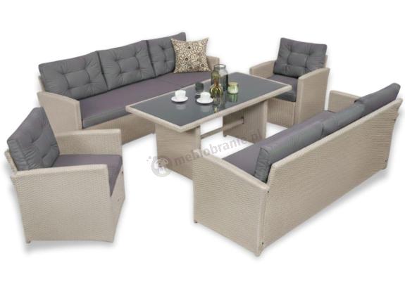 Prezentowany zestaw mebli technorattanowych to propozycja, która spełni oczekiwania nawet najbardziej wymagających Klientów. W skład opisywanego kompletu wchodzi prostokątny, duży stół jadalniany o długości 145cm, dwie duże, 3 osobowe sofy (186cm), oraz dwa fotele. Na każde siedzisko i oparcie przewidziano wygodną poduszkę. Komplet wykonano z bardzo dobrych jakościowo materiałów, zachowując jednocześnie najwyższą dbałość o każdy szczegół. Meble te nadają się nie tylko do użytku wewnętrznego ale i zewnętrznego.