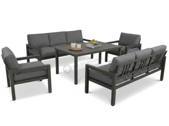 Calamba to propozycja nowoczesnych ogrodowych mebli stworzona z myślą o funkcjonalnych i designerskich ogrodach. W skład opisywanego kompletu wchodzi wysoki stół ogrodowy o wymiarach 160x90cm, dwie sofy trzyosobowe oraz dwa fotele. Na każde siedzisko i oparcie przewidziano grubą poduszkę. Komplet wykonano z wysokiej jakości materiałów, zachowując jednocześnie najwyższą dbałość o każdy szczegół.