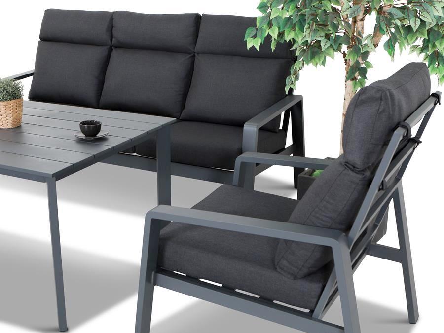 Meble ogrodowe zachowane są w prostym, nowoczesnym stylu - meble będą idealne do miejskich patio, balkonów a także nowoczesnych tarasów. Modernistyczny design wyróżnia je na tle innych zestawów i czyni wyjątkowo atrakcyjnymi. Ogrodowy stół wykończony jest eleganckim blatem o wymiarach 150x87 cm. Posiada on prostą, klasyczną bryłę i jest wykonany z aluminiowych listew, zwiększających funkcjonalność kompletu. Sofa tarasowa to doskonała propozycja zarówno do aranżacji oryginalnych i nowoczesnych, jak i bardziej i klasycznych.