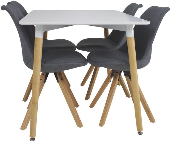 Swój wygląd oraz wytrzymałość zestaw stół i krzesła styl skandynawski design zawdzięczają materiałom, z których są wykonane. Podstawa posiada elegancką tapicerkę oraz wygodną poduszkę w szarym kolorze. Drewniane nogi, dobrze wyprofilowane, wykonane są z drewna bukowego. Pomiędzy nimi widoczne są delikatne łączenia metalowe, jednak dodają one krzesłu industrialnego charakteru.