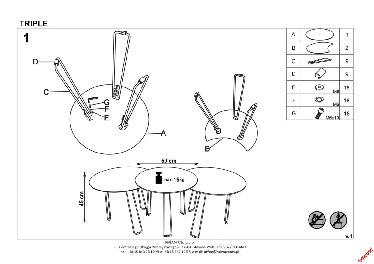 Zestaw składa się z trzech stolików z okrągłym blatem Triple Halmar. Dwa stoliki mają blaty o średnicy 50 cm. Blat trzeciego stolika ma 35 cm głębokości oraz 50 cm szerokości. Wszystkie stoliki mają 45 cm wysokości. Produkty przeznaczone do samodzielnego montażu - instrukcja znajduje się w sekcji "Dostawa i montaż".